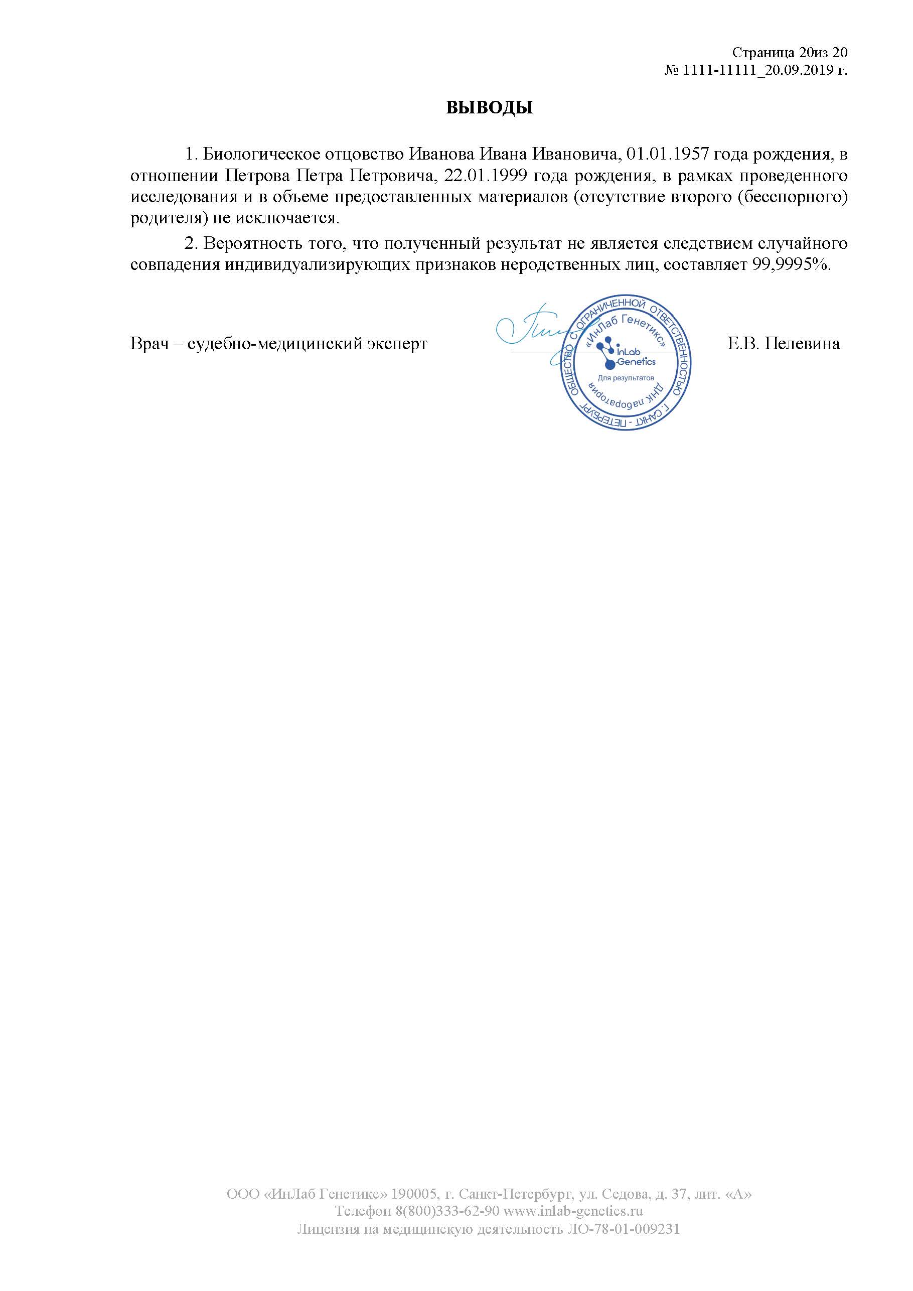 Мы проводим судебно-генетическую экспертизу на отцовство в строгом соответствии с законодательством РФ и соблюдением всех процессуальных нормативов. В результате экспертизы будет подготовлено исчерпывающее экспертное заключение. Это многостраничный прошитый документ, содержащий всю необходимую для суда информацию, который заверяется печатью лаборатории и подписью эксперта-генетика.